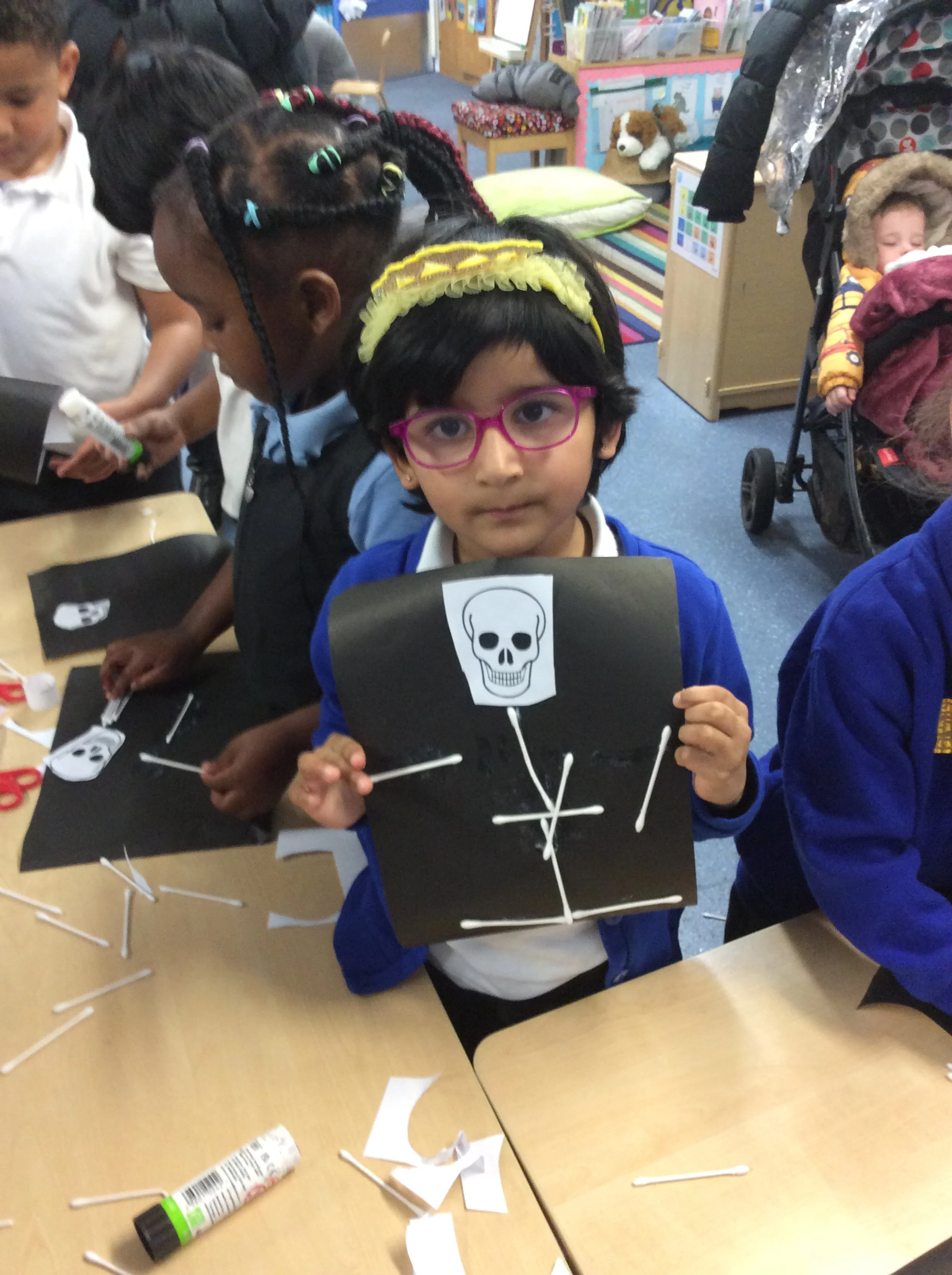 In this story, Nan accidentally swallows a hairpin and has to go for an x-ray! Pupils and parents created their own skeletons together as part of an art activity - don't they look fantastic?